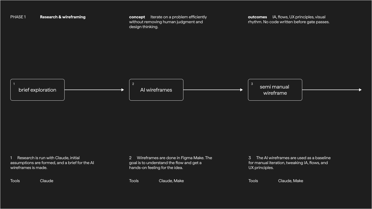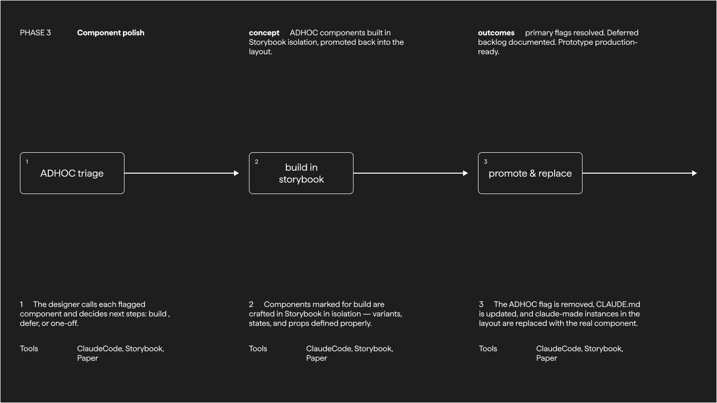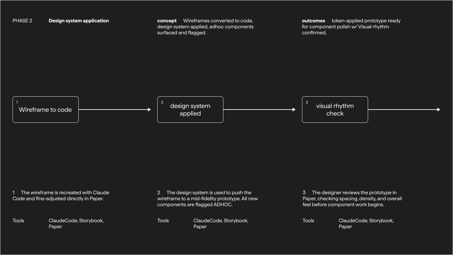 The result: a three-phase pipeline where designers retain judgment on IA and flows, the design system handles consistency mechanically, and developers ship with real components and real data.